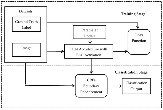 The proposed approach for building extraction, which is equivalent to classical supervised classification, has two stages, namely, a training stage and a classification stage, as shown in Figure 1. During the training stage, the image-label pair is input into the modified FCN network (ELU-FCN) as a training sample. Then, the modified FCN network predicted the class label. The error between the predicted class label and input ground-truth label (GTLabel) is calculated using the designed algorithm and backpropagated through the network using the chain rule. Then, the parameters of the modified FCN network are updated using the mini-batch gradient descent method. The mini-batch gradient descent optimization method was chosen because it possesses the advantages of both batch gradient descent and stochastic gradient descent, which makes it less noisy and more efficient than other approaches. The iteration is stopped when the loss converges. For this, a validation image-label pair is used. In the classification stage, the final trained modified FCN network is used to predict the rough class label of the input image. Then, the rough class prediction, with the input image, is inputted into the CRFs post-classification processing algorithm to generate the final refined binary classification output. The details of this method are presented below.