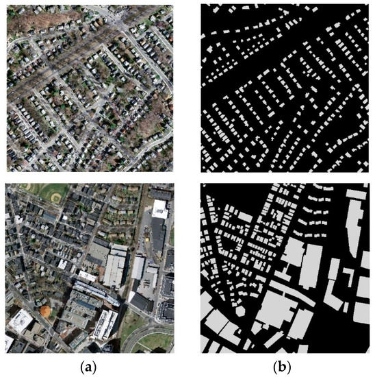 The Massachusetts building dataset that was prepared by Mhin [18] was used in this research. The dataset contained 151 images of the state of Massachusetts. Each image was a 1500 × 1500 pixel RGB image, with a spatial resolution of 1 m, covering an area of 2.25 square kilometers. The target maps that were used for the images were prepared using OpenStreetMap datasets and were also made available in rasterized format. The original images, which were of 1500 × 1500 pixel dimensions, were cropped systematically into 500 × 500 pixel-dimension. Samples from this new dataset are shown in Figure 3.