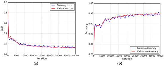 The experiments that were carried out in this research were mostly built on top of the deep learning framework “Tensorflow” [42]. All the experiments were conducted on a server with NVIDIA Tesla K40 of 10,968 MiB. Our main objective in the experiments was to adopt modified FCN as a classifier. As a part of the adopted CNN network, a VGG-16 network that was pre-trained on ImageNet was implemented as a feature extractor freezing 13 convolutional layers. Other layers of FCN were trained using building datasets for fast convergence. Apart from the VGG network, a constant 7 × 7 receptive field was used for networks in the fully convolutional layer at the end of the chosen network. This was devised at [29] and used in the research, keeping in mind that the average dimension of the buildings matches this dimension. A receptive field of lower dimension was not used as it takes longer to train the network. The weights were initialized randomly in each layer (apart from the frozen VGG-13 layer) with a zero-mean Gaussian distribution with a standard deviation of 0.01. For optimization of parameters during training of the network, the Adam optimization algorithm, which is based on mini-batch gradient descent, was applied. The Adam optimization algorithm was adopted due to its high performance in practice compared to other optimization algorithms such as RMSprop, Adadelta, and AdaGrad [43]. Moreover, a decrease in learning rate is automatically synchronized with the iterations in this algorithm.