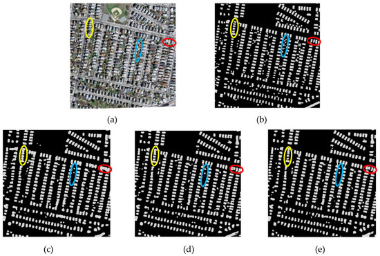 Firstly, for qualitative analysis, visual inspection and comparison of classification maps are performed by considering a representative area for the images, with a special focus on different characteristics of buildings and the surroundings. Figure 5 presents an example of an area from the Massachusetts data and the prediction results that are obtained by applying the FCN network, the modified FCN network (ELU-FCN) and the ELU-FCN in conjunction with post-processing CRFs. The predicted labels, which are shown in Figure 5c, indicate that the FCN network assigns the same class to most of the buildings, except some adjacent small buildings. They either appear as one connected region or do not appear as buildings. Figure 5d shows the predicted labels that are output after the introduction of the ELU-FCN network. This improved the quality of the predicted output compared to the base FCN network. Some of the adjacent connected buildings were well segmented by using the ELU-FCN network, but this was not valid for all the buildings. This is well demonstrated by comparing the building outputs that are encircled by the red circle, for which the introduction of ELU-FCN improved the result from the FCN network. This confirms the reason behind the small increase in the precision value when the base FCN model is improved (discussed in quantitative analysis part of this section). Furthermore, CRFs is also capable of filtering false building patches (see Figure 5e). This characteristic of CRFs helped further increase the precision of the classifier.