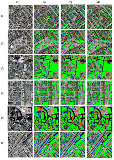 Visualization of predictions of three variations of the proposed model on building detection tasks with original extracted test images from the Massachusetts dataset. (a) input images; (b) results of base FCN network; (c) results of ELU-FCN; and (d) results of ELU-FCN-CRFs. Green pixels are TP, red pixels are FN, blue pixels are FP, and background pixels are TN.
