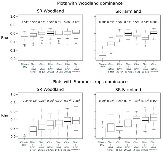 In a second time, we examined whether the best time period of NDVI depended on the plot land cover context. This analysis was only applied to woodland and farmland species richness that were the best explained bird metrics at national scale. We partitioned bird national data into subsets, according to the dominant land cover of the bird plot squares. Landscape composition in each plot was calculated as the proportion of area occupied by four land covers: woody vegetation (including hedgerows), permanent grasslands, winter crops (mainly wheat and barley) and summer crops (mainly maize and sunflower). Because agricultural blocks of the land cover map (RPG) may cover partially the bird plot squares, only the blocks included by at least 70% in the plots were conserved for the estimation. Based on the land cover proportions, four subsets of bird plots were defined with the constraint to obtain a sample size large enough (i.e., with