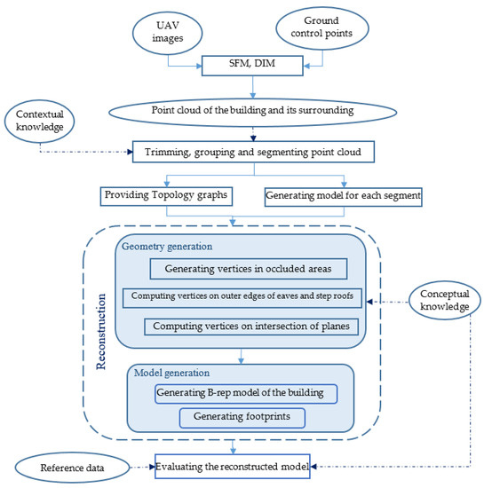 Briefly, this research adopts a RANSAC shape detection method and improves this method, via applying knowledge, to firstly break down high-density point clouds of buildings into smaller sections, and secondly segment them to potential facades and roofs. In addition, point clouds of surrounding grounds of buildings are segmented to generate their footprints. Then, a knowledge-based plane fitting method constructs planar models from segmented patches of point clouds, which are derived from UAV-based photogrammetry. The knowledge is employed to constrain the modelling process in addition to check the reconstructed models. The evaluation step is performed through the new criteria for segmentation and reconstruction. In Figure 1 the workflow of the proposed method is delineated. The details of the method will be explained in Section 3, along with applying the method on data.
