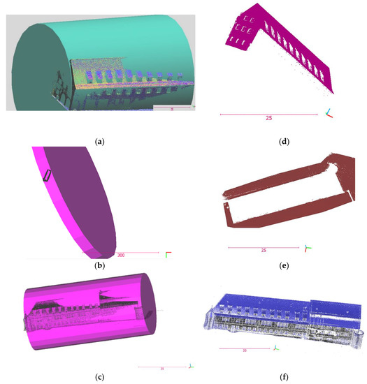 The first level of segmentation: (a,c) using cylinder primitive in dividing point clouds of the buildings, to (d,f) several parts; (b) using cylinder primitive to (e) segment point cloud of the footprint. (Units of axes are m).