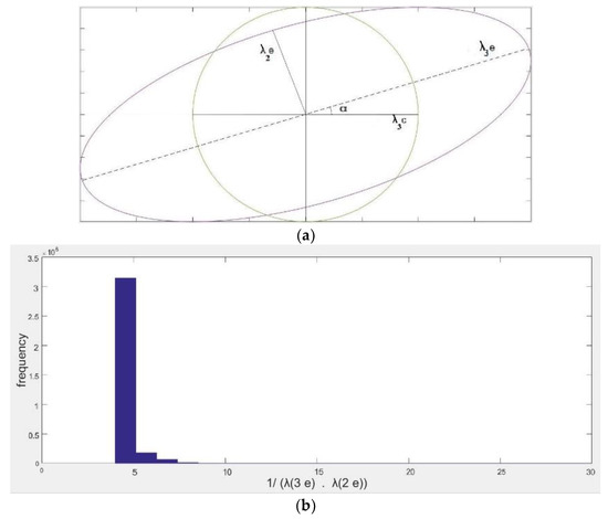 In a homogeneous point cloud, a sphere can show local distribution around a point appropriately. Nevertheless, in a heterogeneous point cloud the direction of the highest local distribution around a point is demonstrated by the longest diameter of the ellipsoid of local distribution. The ratio of areas of the cross sections of sphere and ellipsoid with the horizontal plane implies the ratio of their surface densities. Considering the schematic Figure 4a, the ratio of local surface density on an ellipse-shaped and a circle-shaped neighborhood () is calculated via Equation (6), where are the areas of ellipse and circle, respectively with the same number of points. The circle is the unit circle.
