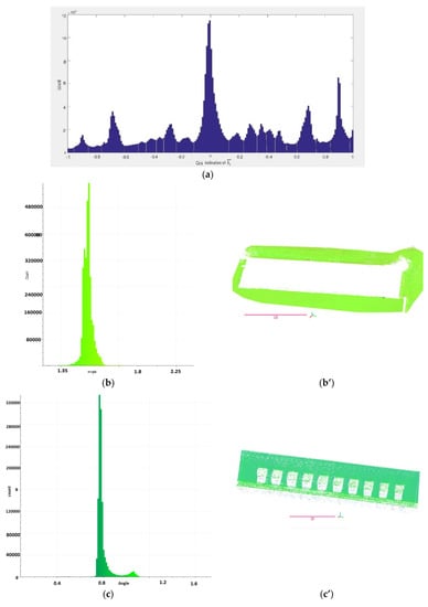 Approximating number of points of the planar segments for the efficient RANSAC. (a) The histogram of cosine of the inclination angle of . (b–e) Histograms of the inclination angle (in radian) of the footprint, roof, step roof and walls. (b’,c’,d’,e’) corresponding marked points in clusters (units of axes are m).