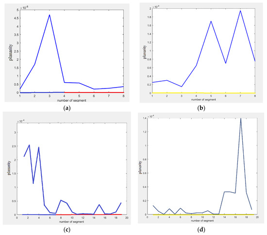 Planarity. (a,c) for the point clouds of the roof (5–8, 7–19), the walls (1–4, 1–7), and (b,d) for the point clouds of the grounds. (a,b) point clouds of building 1, and (c,d) point clouds of building 2.