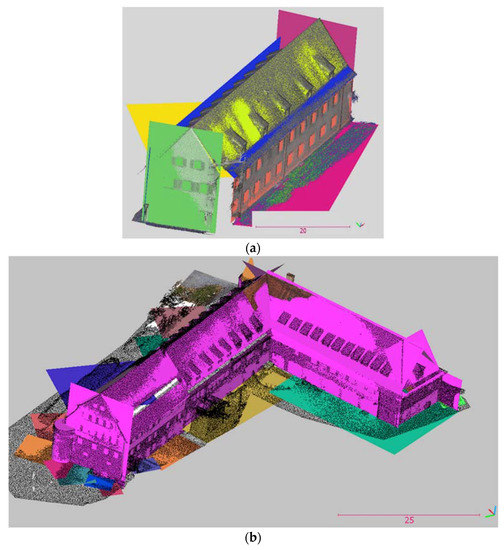 Figure 7 shows the planar models superimposed on the point clouds of building 1 (Figure 7a) and 2 (Figure 7b). In occluded parts, there is no data; therefore, no model is generated in these areas.