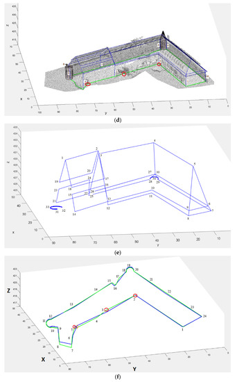 In order to evaluate the reconstructed models, an experienced operator digitized the reference models on the geo-referenced point clouds. In Figure 8c,f, the reconstructed footprints besides their reference data are displayed. In the reconstructed footprints, vertices with red are for building 1 (Figure 8c) and the orange star for building 2 (Figure 8f) were not generated by the reconstruction approach, though they were digitized in the reference model.