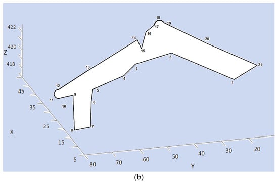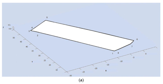 Areas of the horizontal segments are approximated employing horizontal edges in Figure A4 through Equation (A2), where at height of is horizontal edge in x-z view, is horizontal edge in y-z view and is the area of the plane, which is surrounded by and . Number of points of the horizontal step roof in height of () is estimated via Equation (A3).