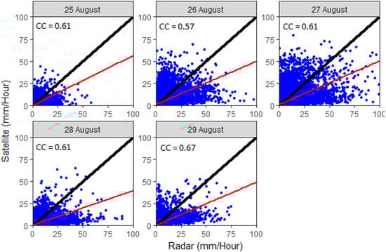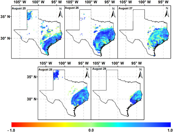 - CC spatial distributions during five consecutive days reveal that when the hurricane advanced to the category 4 storm (2nd day/26 August); although most of the sub-regions showed high CC values, near the center of the hurricane (hurricane eye), there is negative correlation. It indicates the complex internal structure and spatial variability of the storm was not well captured by the satellite. Additionally, lower quality input data from multiple sensors can intensify the inconsistency of the satellite products. Therefore, deeper understanding of IMERG product’s diurnal cycle may help to generate better algorithm for estimating precipitation records in future.