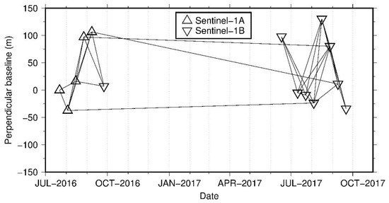 The connections between 12 Sentinel-1A/B SAR images with the perpendicular and temporal baselines.