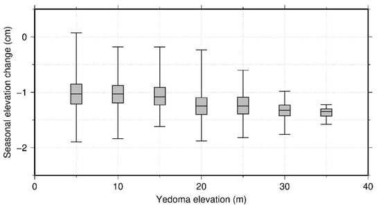 Box plot (minimum, first quartile, median, third quartile, maximum) for seasonal subsidence at different Yedoma elevations during the thaw season of 2017.