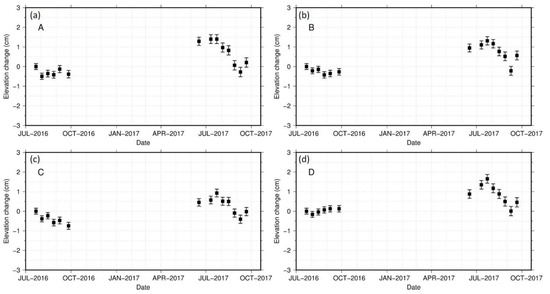 Time series of elevation changes based on our InSAR measurements at points (a) A; (b) B; (c) C; (d) D relative to the first acquisition on 22 July 2016. The error bars denote the uncertainty of the InSAR time series. The locations of the four points are shown in Figure 1.
