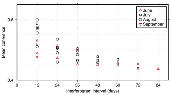 Mean coherence over the Yedoma upland for all the 2017 interferograms. The legend symbols denote the months of the master images used to construct the interferograms.