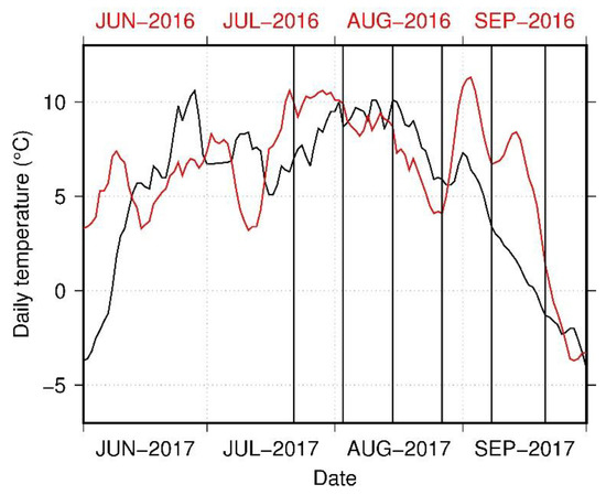 Daily air temperature for the thaw season of 2016 (red) and 2017 (black). The six vertical solid lines denote the dates of the inter-annual SAR acquisition pairs.