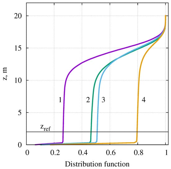 Distribution function of ALS hits in the RAMI pine stand. 1—first hits, 2—all hits, 3—weighted hits, 4—last hits.