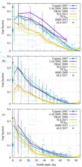 Variability of gap fraction estimates from LAI-2000 data, TLS data, and hemispherical photos increased with decreasing view zenith angle due to a decrease of averaging, and therefore the extrapolation of these gap fraction estimates to zenith is problematic. These gap fraction estimates were approximated by the analytical expression of the gap fraction of a canopy of elliptical orientation in the range of view zenith angles VZA = 10–70° [28]. The approximation curves are in Figure 6, with thin smooth lines of the same color as the recorded data. Approximation curves were extrapolated to zenith.