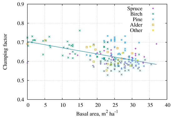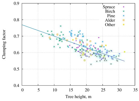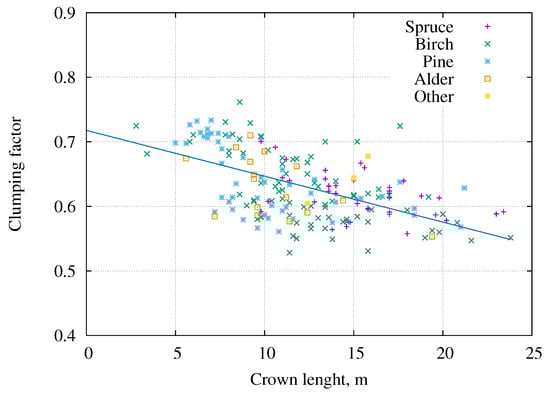 In July 2017, the ALS data were collected over numerous homogeneous forest stands large enough to get robust estimates of tree height, crown length, and clumping parameter value c in Equation (5). Based on the analysis of ALS data by Arumäe and Lang [33], the stand height was determined as the 80% level of hits. The crown length was estimated as the range of the hits height where the distribution density exceeded the level , where . The selection of stands included 84 birch stands with age from 10 to 130 years, 50 pine stands with age from 50 to 195 years, 39 spruce stands with age from 10 to 205 years, 18 common alder stands with age from 10 to 155 years, and three stands of other species. The range of forest heights was from 4 to 32 m, and crown lengths ranged from 3 to 24 m. In most cases, the share of main species in stands was over 50%, and in 70 stands it was over 90%. The site index varied in the range from 12 m to 38 m. The allometric LAI using relations by Marklund [34] and Repola [35] was in the range from 0.3 to 11.2 and from 0.3 to 13.2, respectively. The relation of the clumping parameter c to some stand parameters was close to linear, and correlation coefficients were as high as 0.74 (the absolute value), see Table 2 and Figure 8, Figure 9 and Figure 10. The multiple correlation coefficient of two independent parameters—tree height and crown length—and clumping parameter c was 0.79.