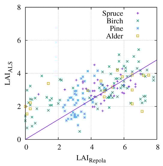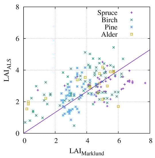 At the same time, the allometric LAI estimates also differed. Their mutual correlation coefficient was = 0.85 . Allometric LAI estimates used the mensuration data of 2011. Therefore, the allometric LAI values of young stands (low LAI values) were obviously underestimated, and we could expect an even better correlation of allometric and ALS LAI estimates if simultaneous data were used.