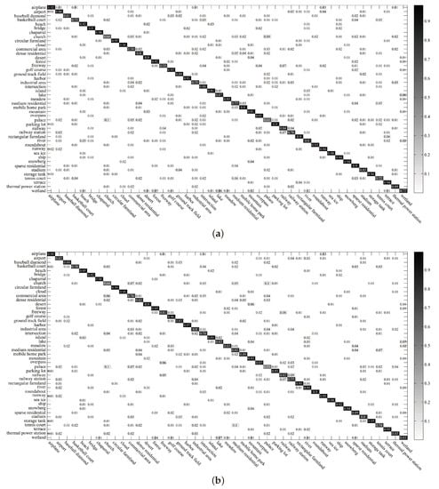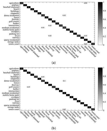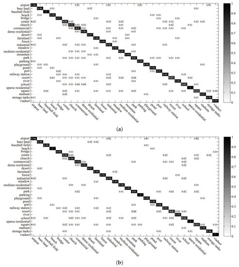 Figure 12), it should be noted that our methods can get the classification accuracy rate of more than 0.95 under most scene categories, including bare land (a: 0.96, b: 0.96), baseball field (a: 1, b: 0.99), beach (a: 0.98, b: 1), bridge (a: 0.97, b: 0.98), desert (a: 0.97, b: 0.97), farmland (a: 0.96, b: 0.98), forest (a: 0.99, b: 0.99), meadow (a 0.99, b: 0.99), mountain (a: 0.99, b: 0.99), parking (a: 0.99, b: 1), playground (a: 0.98, b: 0.98), pond (a: 0.98, b: 0.99), sparse residential (a: 1, b: 1), port (a: 0.97, b: 0.98), river (a: 0.96, b: 0.99), stadium (a: 0.97, b: 0.99), storage tanks (a: 0.98, b: 0.96), and viaduct (a: 0.99, b: 1). At the same time, our methods can obtain relatively good performance under some scene categories that are difficult to recognize. For instance, from the results obtained by using the multilevel fusion method [