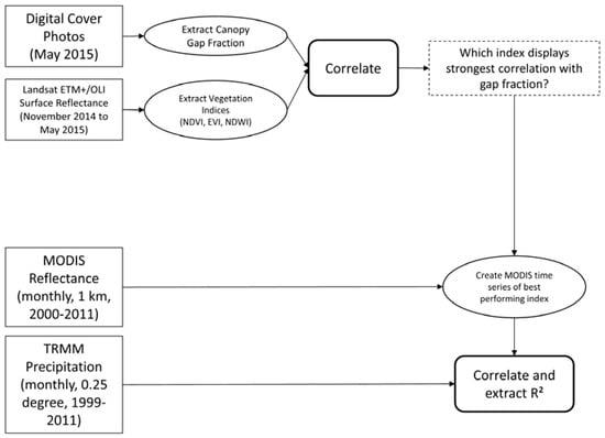 This paper analyzes the relationships at three levels of spatial aggregation between in situ measurements of canopy gap fraction, and three multispectral vegetation indices derived from Landsat data in the Southern Yucatán Peninsula. The findings from that analysis then inform an investigation into the role of precipitation as a driver of deciduous phenology over 11 years in the region, with results compared to prior work that regressed MODIS EVI against rainfall [] without incorporating in situ or Landsat reflectance data in a capacity beyond reference data. In accomplishing these objectives, the paper: (a) employs digital canopy photography as a way to gather a substantial amount of in situ canopy observations over a large spatial area; (b) evaluates the correspondence of three Landsat-derived vegetation indices with ground observations; (c) considers how the strength of these relationships changes as data are spatially aggregated to increasingly coarser scales; and (d) demonstrates with an analysis of MODIS data that the relative usefulness of the evaluated vegetation indices for describing deciduous phenology that was observed using fine-spatial data also prevails when coarse-scale data are used.