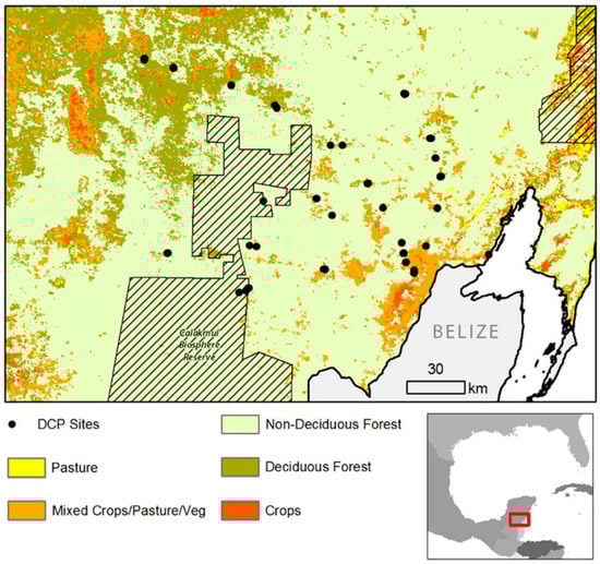 This analysis examines the southern Yucatan Peninsula within the rectangular area enclosed by (19.25°, −90.25°) and (17.75°, −87.5°), an area that encompasses the Calakmul and southern Sian Ka’an Biosphere Reserves. The population is concentrated in the coastal areas in and around Chetumal, the capital of Quintana Roo. Slash and burn agriculture, as well as permaculture, is a common livelihood strategy in the central part of the study area, with livestock cultivation more common in the west [].