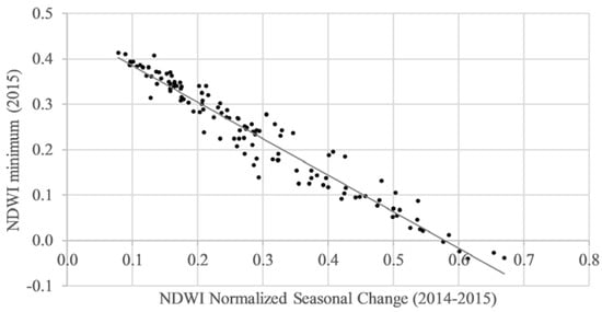 Regression of minimum observed Normalized Difference Water Index (NDWI) values in 2015 against the normalized seasonal change of observed NDWI in 2014–2015 (N = 250).