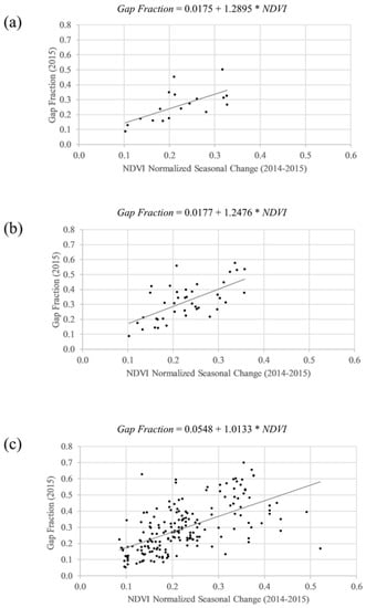 Regression models of DCP measurements of gap fraction against normalized seasonal change of NDVI, at the scale of (a) site, (b) cluster, and (c) observation.