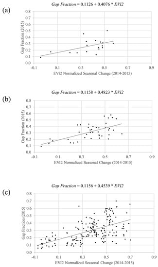 Regression models of DCP measurements of gap fraction against Normalized Seasonal Change of the two-band Enhanced Vegetation Index (EVI2), at the scale of (a) site, (b) cluster, and (c) observation.