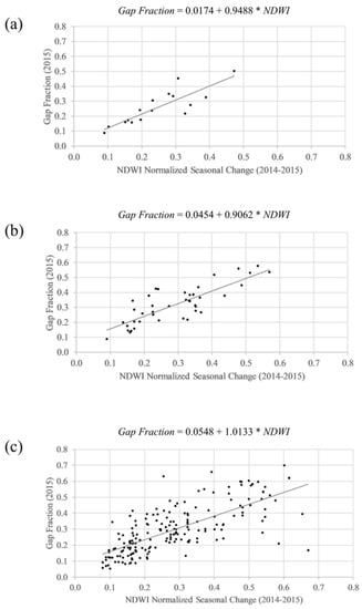 Regression models of DCP measurements of gap fraction against normalized seasonal change of NDWI, at the scale of (a) site, (b) cluster, and (c) observation.