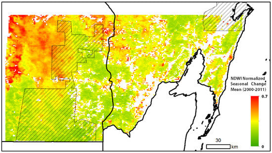 The spatial pattern of the 2000–2011 average NDWI normalized seasonal change (Figure 9) strongly resembled that of the coefficient of determination from the regression model using NDWI and TRMM rainfall. The highest values were observed in and to the immediate northwest of the Calakmul Biosphere Reserve, as well as to its northeast. Low values are seen in and around the south of Calakmul, as well as in the northeast of the study area, southwest of the Sian Ka’an Biosphere Reserve.