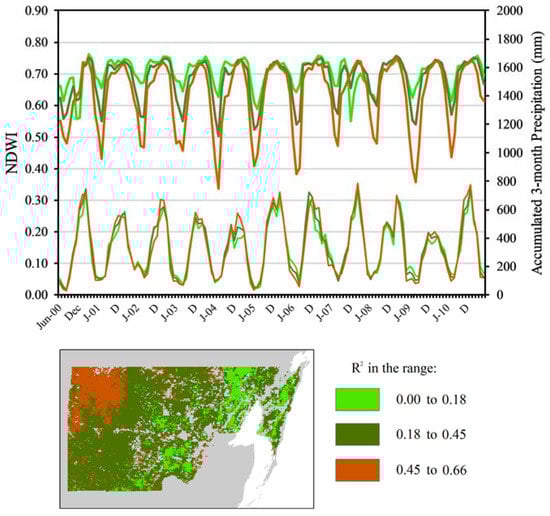 Temporal profiles of monthly NDWI (thick lines) and accumulated, three-month TRMM rainfall (thin lines), averaged for all of the forest pixels in three classes determined by pixels’ coefficient of determination values for the regression of monthly MODIS NDWI, and TRMM rainfall, 2000–2011.
