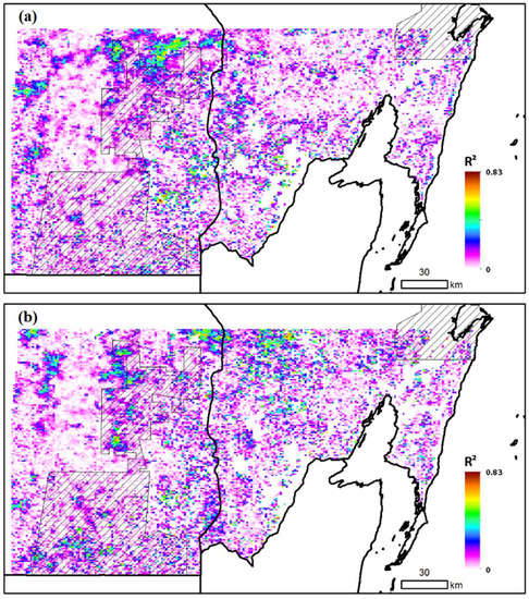 Per-pixel (1 km) coefficient of determination from regression model using MODIS NDWI and Tropical Rainforest Measuring Misson (TRMM) accumulated, three-month rainfall, for all of the forest land-cover pixels, using data from all of the months (N = 132). The Calakmul and Sian Ka’an Biosphere Reserves are shown as hatched areas for reference.