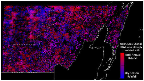 Composite image showing for each forest pixel the relative strength of correlation between MODIS NDWI and total annual TRMM rainfall (red), and MODIS NDWI and total dry season (January to May) TRMM rainfall (blue). Strong correlation for both regression models is seen in pixels that are purple. Dark pixels show weak correlation for both regression models.