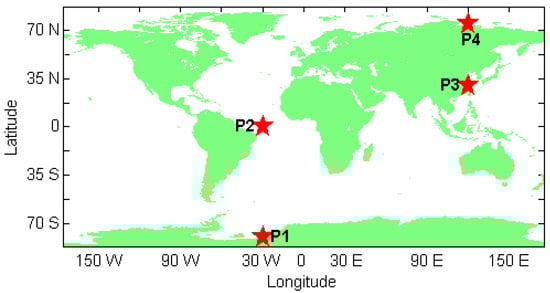 In order to fully demonstrate the contribution of the LeGNSS system to PPP solutions, four stations located at P1 (80°S, 30°W), P2 (0°S, 30°W), P3 (30°N, 120°E), and P4 (75°N, 120°E) are adopted for the kinematic mode of PPP tests with GPS-only, GPS/BDS (G/C), GPS/LEO (G/L), and GPS/BDS/LEO (G/C/L) (i.e., the LeGNSS system). The locations of the stations are shown in Figure 3. In this study, the convergence time of the positioning solution is defined as the time when the positioning errors for each component reaches ±10 cm and stays within that value.