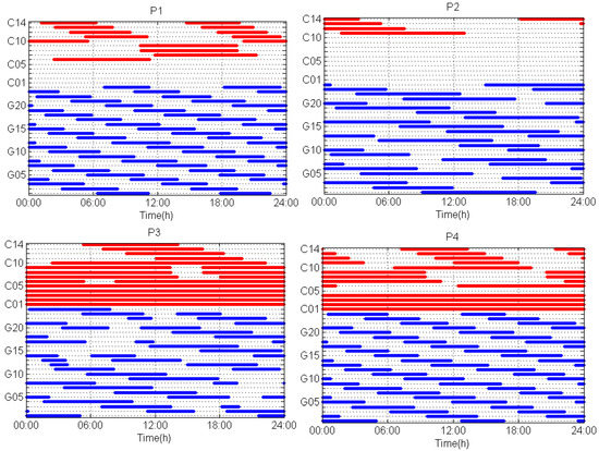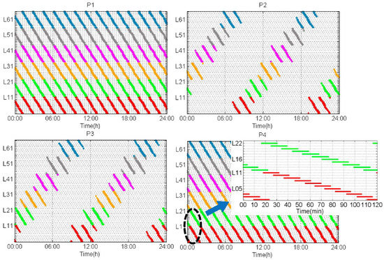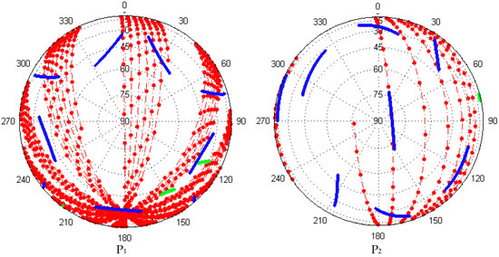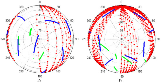 The tracking period of LEO satellites is shown in Figure 5. We can easily see the very short time span of LEO satellites with respect to the ground station. It is only about 5–10 min and much shorter than that of GNSS satellites. This is mainly because of the low Earth orbit of LEO satellites, causing the fast motion with respect to the ground stations. Such fast motion gives an opportunity to shorten the convergence time. On the other hand, since the LEO satellites are usually polar satellites with the orbital period of about 1.5 h, every LEO satellite in one orbit plane would be tracked by polar stations for every 1.5 h, e.g., P1 and P4. Thus, stations at high latitude can track one specific LEO satellite by more than ten times a day, e.g., P1 and P4, while only four to five times for stations in low and medium latitude, e.g., P2 and P3 because of the polar orbit and small footprint of LEO satellites, which were already mentioned in the section of satellite visibility and availability.