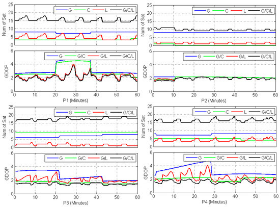 This fast motion can also be observed from the quick variation of GDOP values. Figure 7 shows the number of satellites and their corresponding GDOP values for different combinations of four stations. These four stations can generally observe seven to ten GPS satellites and the GDOP of GPS-only is generally from 2 to 4. The number of tracked BDS satellites mainly depend on the location of stations since BDS provides service only in Asia-Pacific areas currently. The GDOP values of G/C are much smaller than those of GPS-only, except for stations P1 and P2. As shown in Figure 6, though there are three to four BDS satellites tracked by station P1, the low elevation and short arc of BDS satellites make the geometric distribution of G/C almost the same as GPS-only. For station P2, since it is out of the BDS service region, the GDOP values of G/C are unchanged compared to GPS-only. For stations P1 and P4, 5–8 LEO satellites can be tracked while only 1–2 can be tracked for stations P2 and P3 since the higher latitude of P1 and P4. The GDOP values of G/C/L are smaller than those of G/C for stations P1 and P4, which attribute to the increased number of LEO satellites.