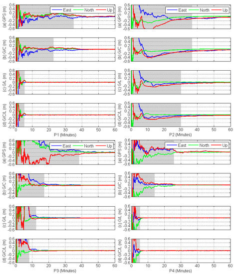 With the aforementioned characteristics of the LeGNSS, including the time span, sky plot, and GDOP values, Figure 8 presents the kinematic PPP results for GPS-only, G/C, G/L, and G/C/L, respectively. Here we show the hourly results just in order to clearly see the convergence time. The convergence times of different combinations for all stations are listed in Table 2. As we can see, the GPS-only PPP needs nearly 30 min to converge when the positioning errors of three components are all smaller than 0.1 m. Except for station P2, the G/C PPP significantly shortens the convergence time against the GPS-only case. Station P2 is not within the BDS service region and only one BDS MEO satellite is tracked, as shown in Figure 7, which has nearly no contribution to the convergence time. For the other stations, the convergence time is 10 min faster than the GPS-only case, where the G/C GDOP values become smaller.
