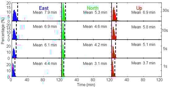 The distributions of convergence time for sampling intervals of 30, 10, 5, and 1 s G/C/L PPP are shown in Figure 10. The averaged convergence time is generally 10.0 min for all the components at all sampling intervals. With higher sampling interval, the convergence time is shorter. This reason is that the LEO satellites are moving fast, every second can already achieve great geometric change with respect to the ground stations. It takes 7.9, 5.3, and 6.9 min for east, north, and up components to converge with 30 s sampling interval while 6.9, 4.9, and 5.8 min with 10 s sampling interval, respectively. Further increasing the sampling interval does not shorten the convergence time significantly anymore, which means that the satellites’ geometric change with respect to the ground stations are not great enough to improve the PPP convergence time. The convergence time of 5 s sampling interval is almost the same as that of 10 s. The averaged convergence time of 1 s sampling interval is the shortest, which are all smaller than 5.0 min, with the improvement of 44.3%, 41.5%, and 46.4% compared to those of the 30 s sampling rate for east, north, and up components, respectively.