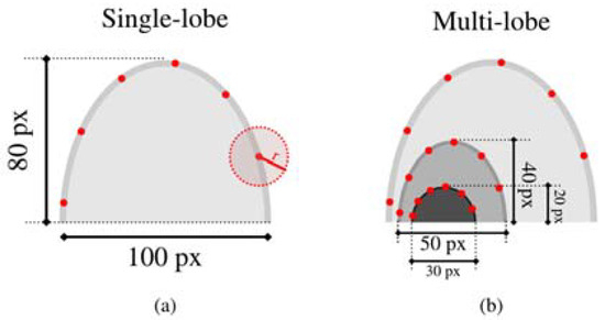 - Single-lobe: the deforming active lobe is modeled by a semi-ellipse (vertical semi-axis of 80 pixels, horizontal axis of 100 pixels, Figure 2a).