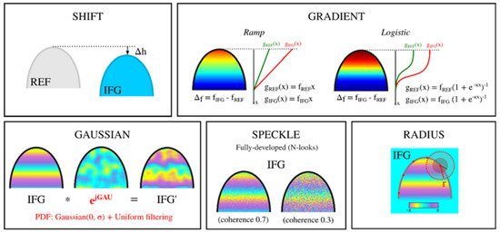 Sensitivity analysis with simulated data. Schematic depiction of the simulation experiments. SHIFT: robustness of the warp demodulation method against downward shifts Δh of the IFG active lobe; GRADIENT: algorithm sensitivity to along-lobe deformation differences between REF and IFG for ramp/logistic deformation gradients; GAUSSIAN: IFG affected by Gaussian noise; SPECKLE: IFG affected by fully developed speckle; RADIUS: Impact of patch radius on demodulation performance.