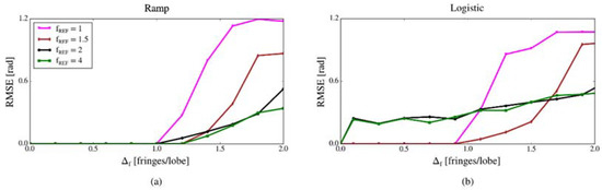 Logistic gradient: If fringes/lobe, the RMSE remains approximately equal to zero until approximately = 1 fringe/lobe, when it abruptly increases, reaching a maximum of 1.05 rad at = 1.7 fringes/lobe. The same behavior with , although with a less abrupt increase, is also found for fringes/lobe. If fringes/lobe, the RMSE shows a positive association with (Pearson’s correlation coefficient ); in this case, the statistics appear substantially insensitive to and range from a minimum of 0.2 rad (at = 0.3 fringes/lobe) to a maximum of 0.5 rad (at = 1.9 fringes/lobe).