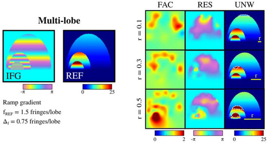The warp demodulation is also applied to a multi-lobe scenario with fringes/lobe and fringes/lobe (ramp gradient). As shown in Figure 6, a small radius results in localized phase errors within the main lobe (RMSE = 0.206 rad). When , the phase gradient along the main lobe is accurately reconstructed. However, a number of phase artifacts within the secondary lobes can now be observed. The number of artifacts, and hence the RMSE, appear to increase with increasing ( RMSE = 0.181 rad, RMSE = 1.318 rad).
