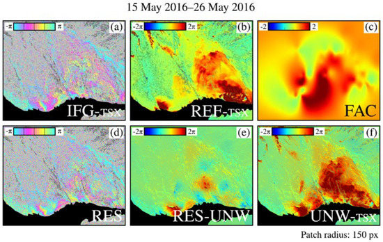 Also, for the other two cases (Figure 10 and Figure 11) involving sensors with considerably coarser resolution, our method still performs satisfactorily in producing phase residuals that are both spatially smooth and sufficiently small to reconstruct the unwrapped phase of the test interferograms. Reconstruction is not perfect, firstly due to the error sources identified in Section 3.1 (e.g., migration and introduction of deformation discontinuities), plus a few additional ones (such as small unwrapping errors in the reference in some small layover regions but particularly in the fast-moving area where the eastern lobe meets the Fels Glacier). Errors in the reconstruction are by and large limited to this fastest moving part of the slide (most visible in Figure 10e, the unwrapped residual of the ALOS-1 case), where the reference likely would also not be representative due to separation in time even in the absence of any phase unwrapping errors.