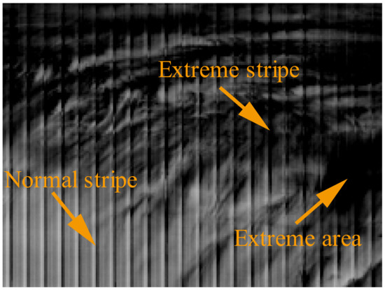 Many destriping techniques assume that stripe noise presents in the whole column on an image, which is not always true. In some extremely dark or too bright areas, stripe noise is saturated and noise in these regions is almost zero. Therefore, it is not necessary to further estimate noise in these areas. Nevertheless, if an area’s extreme values were generated by a strong stripe, we should recover these elements. Here, we name these areas strong stripe area (SSA), also called the extreme stripe area. Therefore, distinct extreme area (EA) and SSA are necessary. An example of SSA and EA is illustrated in Figure 3.