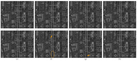 Figure 19 and Figure 20 display the moderate level stripe estimation comparison. In each method’s result, the top part is the destriping result, and the bottom part is the corresponding stripe noise estimation. To provide a better visualization, these estimated stripes are linearly stretched to range . Generally, besides BM3D, most noise is removed by most methods. However, the blur degree and noise estimation ability of these methods vary. Some tiny stripes remain in the GF-based method, as marked in the orange yellow ellipsoid in Figure 20d. For the UV and HUTV methods, the blur effect appears in the structure similar to stripe, as in Figure 19f,g and Figure 20f,g. The SUV model can estimate the most stripe noise. Unfortunately, some tiny horizontal details are also removed, resulting in details loss, as displayed in Figure 19h and Figure 20h. Observing the estimated stripe noise in Figure 19 and Figure 20, we can discover that our WDSUV model generates a more regular stripe image than the other state-of-the-art methods, demonstrating that the proposed model has a better stripe noise estimation ability.