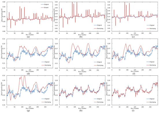 Mean cross-track profiles of Terra MODIS data R4. (a) original; (b) BM3D; (c) SNRCNN; (d) GF-based; (e) WAFT; (f) UV; (g) HUTV; (h) SUV; (i) WDSUV.