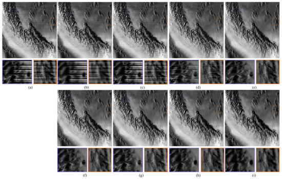 First, we analysed the destriping performance of BM3D and SNRCNN methods. There are plenty of obvious residual stripes existing in the results of BM3D (Figure 7, Figure 8, Figure 9, Figure 10, Figure 11, Figure 12, Figure 13 and Figure 14a) and SNRCNN (Figure 7, Figure 8, Figure 9, Figure 10, Figure 11, Figure 12, Figure 13 and Figure 14b). The strong stripe noise seriously affects the grouping step and collaborative filtering step in BM3D, resulting in a poor destriping ability. The weak performance of SNRCNN on stripe noise removal can be attributed to the difference between the training data of SNRCNN and our striped data. In the training procedure of SNRCNN, the small intensity stripe noise is added on the clean training data. However, the stripe of various intensity is generated in our simulated data.