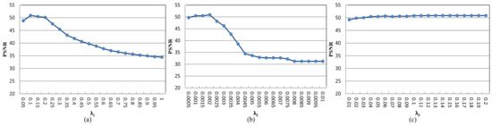 PSNR curves of regulation parameters. (a) PSNR curve of parameter (); (b) PSNR curve of parameter (); (c) PSNR curve of parameter (, ).